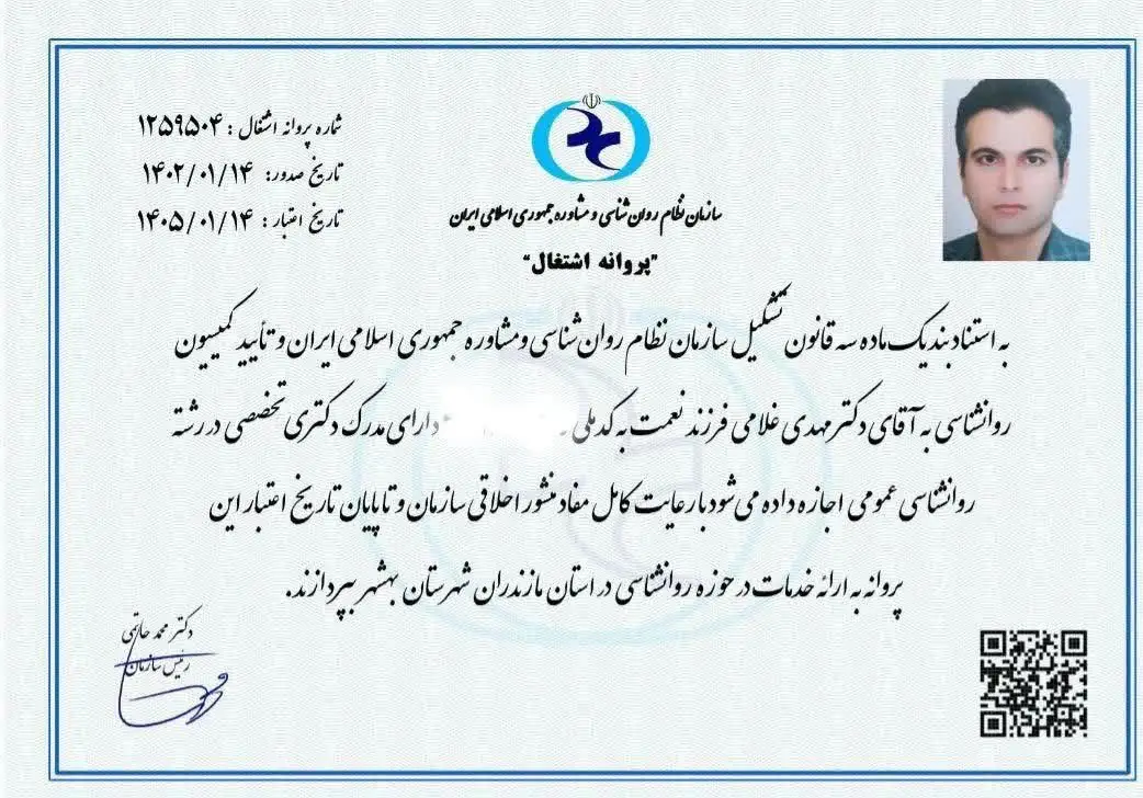 • دارای پروانه اشتغال از سازمان نظام روانشناسی و