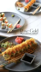 - سوشی : با وجود ریشههای ایرانی، رزگلد بهطور هوشمندانه از غذاهای بینالمللی نیز بهره میبرد. بخش سوشی و رولهای ژاپنی (با بهروزترین استانداردهای بهداشتی و استفاده از ماهی تازه و وارداتی) شامل رولهای کالیفرنیا، سالمون آووکادو، تون مخصوص و رولهای گیاهی است. ساشیمی و تمپورا نیز در منوی ویژه قرار دارند.