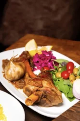 - غذاهای سنتی : فسنجان با مرغ و شیره ی انگور واقعی، قورمه سبزی با لیمو عمانی، کلهپاچه صبحگاهی، بادمجانپر شده، آبگوشت دمی و کوفته تبریزی ویژه. همهی غذاها با برنج دمی دوباره، کرهی محلی و زعفران سرخ شده در دم سرو میشوند.