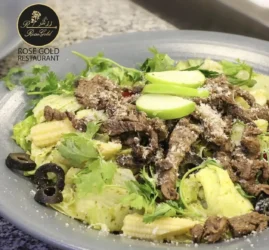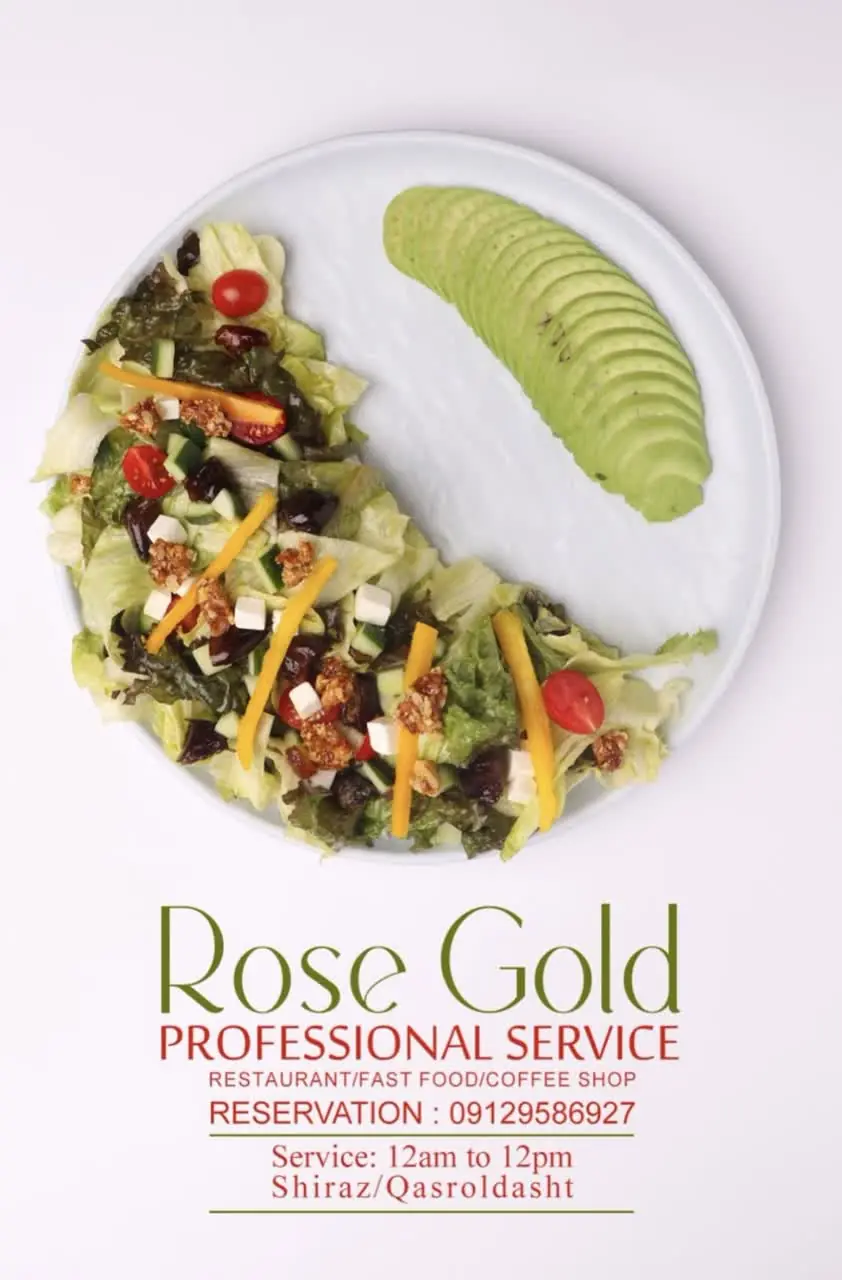 - پیشغذا و سالادها : آغاز هر وعده در رزگلد با پیشغذاهای خوشمزه و تازه است. سالاد شیرازی، سالاد فصل (با سبزیجات تازه، آووکادو و گوجهفرنگی گیلاسی)، سالاد ماکارونی سرد، سالاد سزار و سالاد مرکب (با گوجه، خیار، پیاز، نعنا و زیتون) از محبوبترینها هستند. همچنین، پیشغذاهایی مانند دلمه برگ مو، کاهو پلو، میرزاقاسمی، کدو حلوایی سرخشده و سبزی خوردن تازه با پنیر لیقوان و گردو، بسیار مورد استقبال قرار میگیرند.