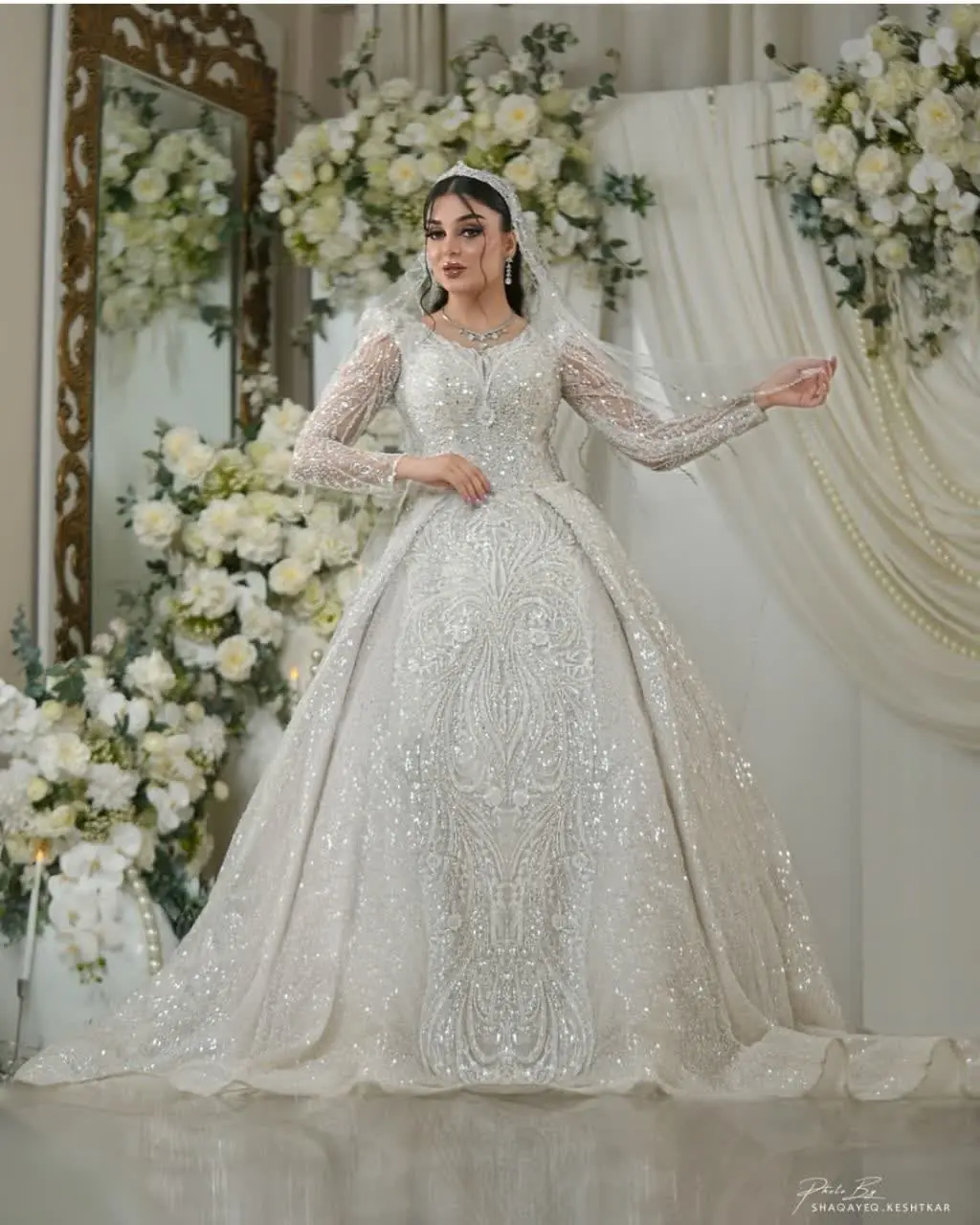 - لباس عروسی: اوج زیبایی و جلوه در این لباس است. طرحها میتوانند کلاسیک (مانند لباسهای سنتی با دوخت دو چین و تور) یا مدرن (با خطوط ساده و تزئینات مینیمال) باشند. استفاده از حریر، تفتا، تور و کریستالهای درخشان، از رایجترین انتخابهاست.