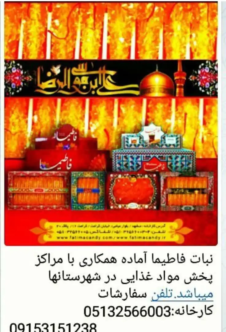 نبات فاطیما تولید کننده نبات شاخه و نی دار زعفرانی و سفید به صورت فله و بسته بندی از سال ۱۳۸۳ فعالیت خود را شروع نموده است. در راستای فعالیت در شهرستانها از بین پخشها و مراکز عمده فروش مواد غذایی نماینده میپذیرد .