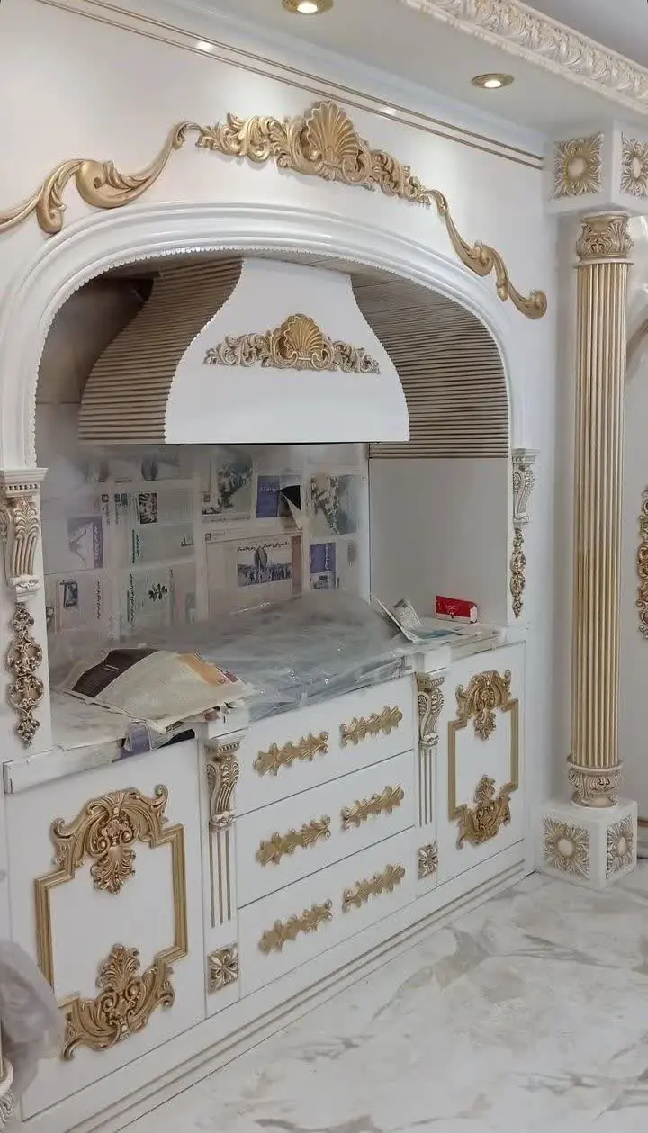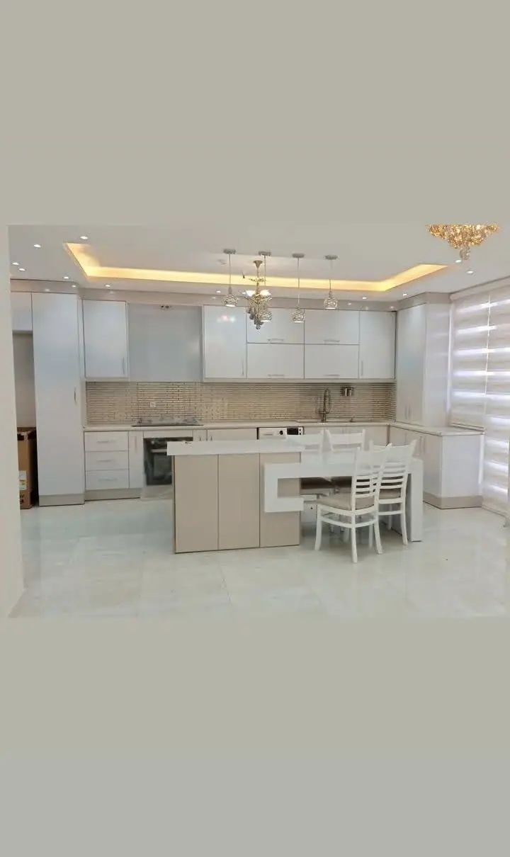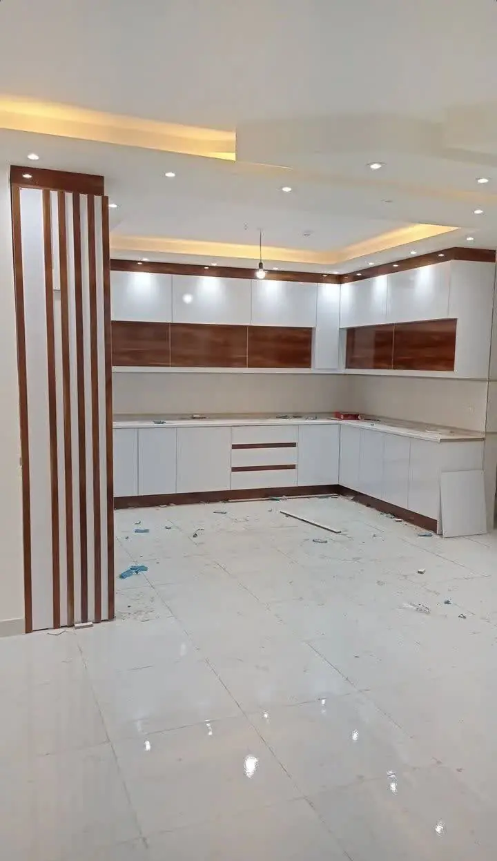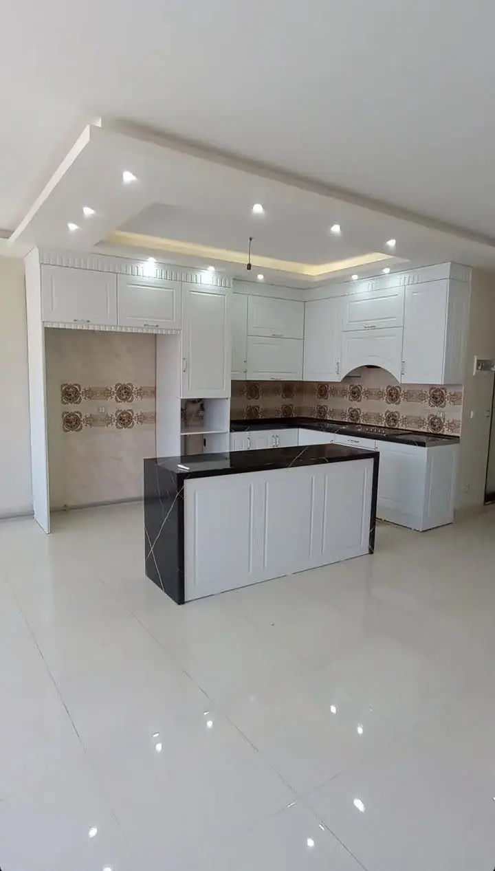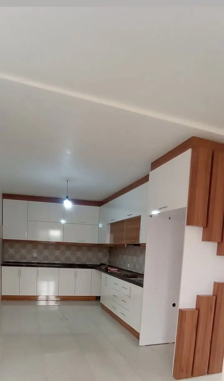- آشپزخانه: کابینتهای بالایی و پایینی با قفسهبندی هوشمند، فضای ذخیرهسازی را بهینه کرده و دسترسی به وسایل را آسان میکنند.