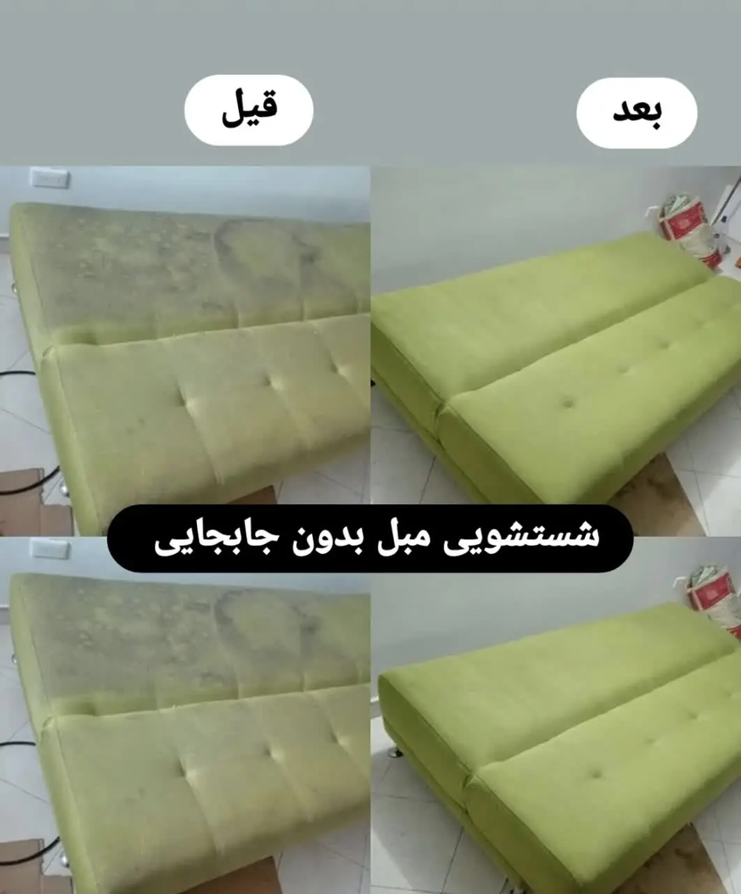 • شستشو با دستگاه فرش‌شویی صنعتی: برای مبل‌های با روکش قابل جدا شدن (پارچه‌ای)، که امکان شستشوی عمقی و کامل را فراهم می‌کند.