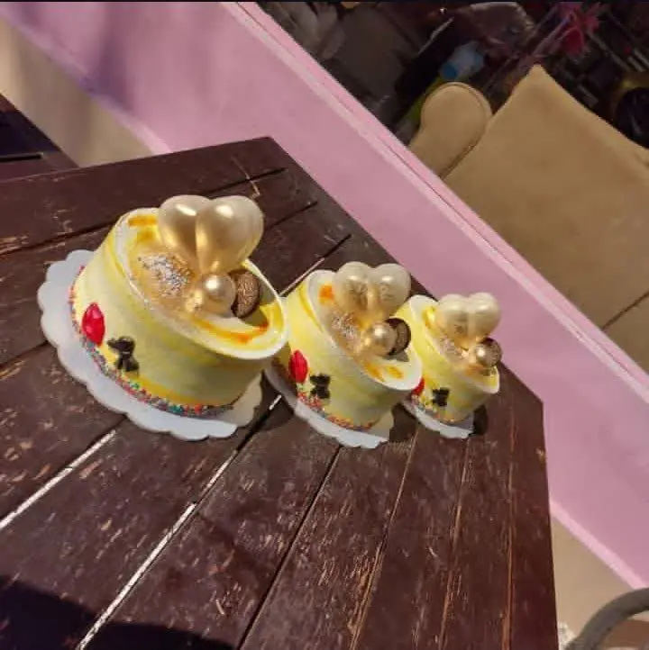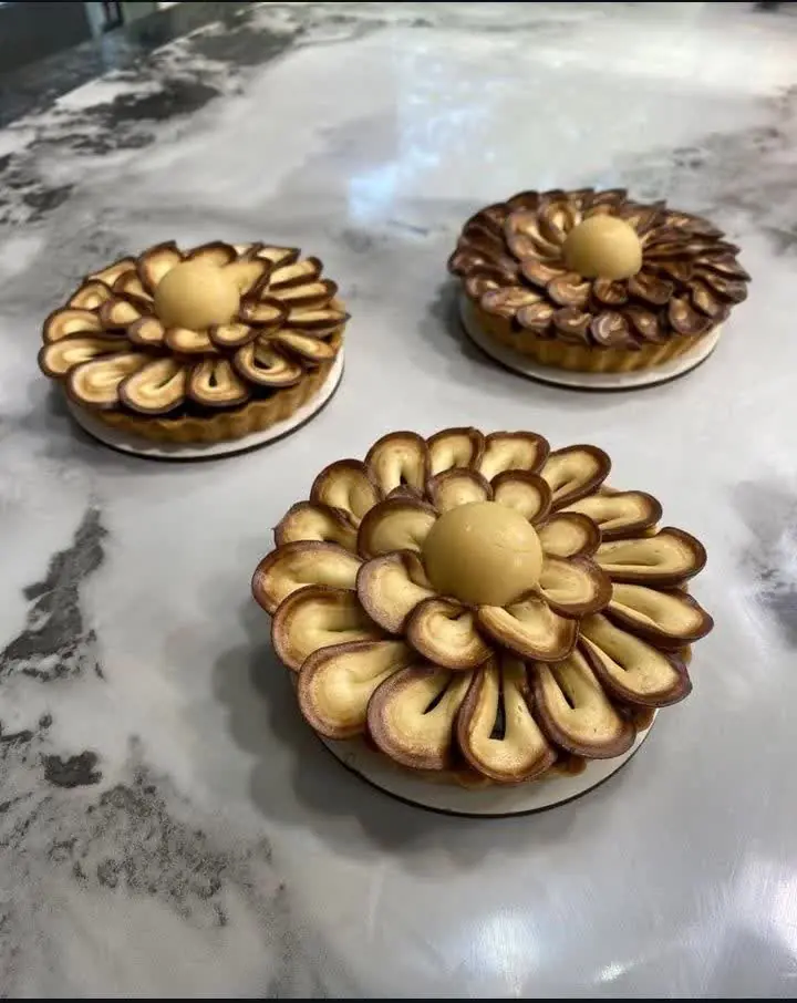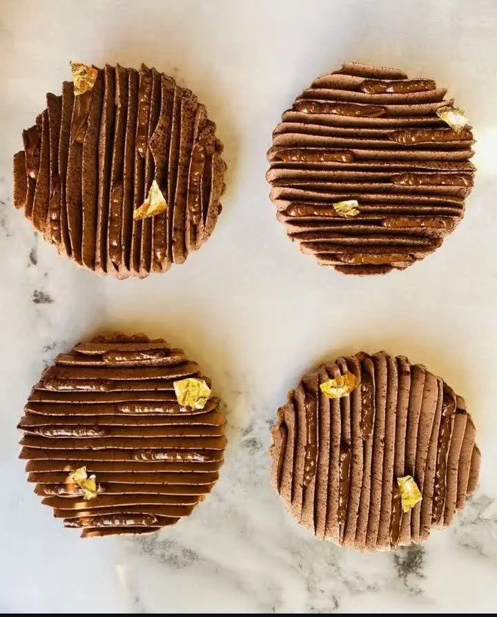 • لایه‌بندی چندگانه با فیلینگ‌های متنوع (خامه‌آلبالو، موز-کارامل، گاناش تلخ)