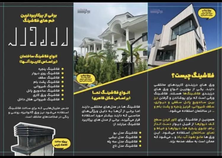 فلاشینگ نما در واقع لایه محافظتی فلزی یا کامپوزیتی است که در درزها، اتصالات و لبه‌های نما نصب می‌شود تا آب باران، برف ذوب‌شده و بخارات رطوبت را به سمت پشت‌بام یا محیط خارج هدایت کند و از نفوذ آن به ساختار زیرین جلوگیری کند. انواع رایج فلاشینگ نما را می‌توان به شکل زیر دسته‌ بندی کرد: